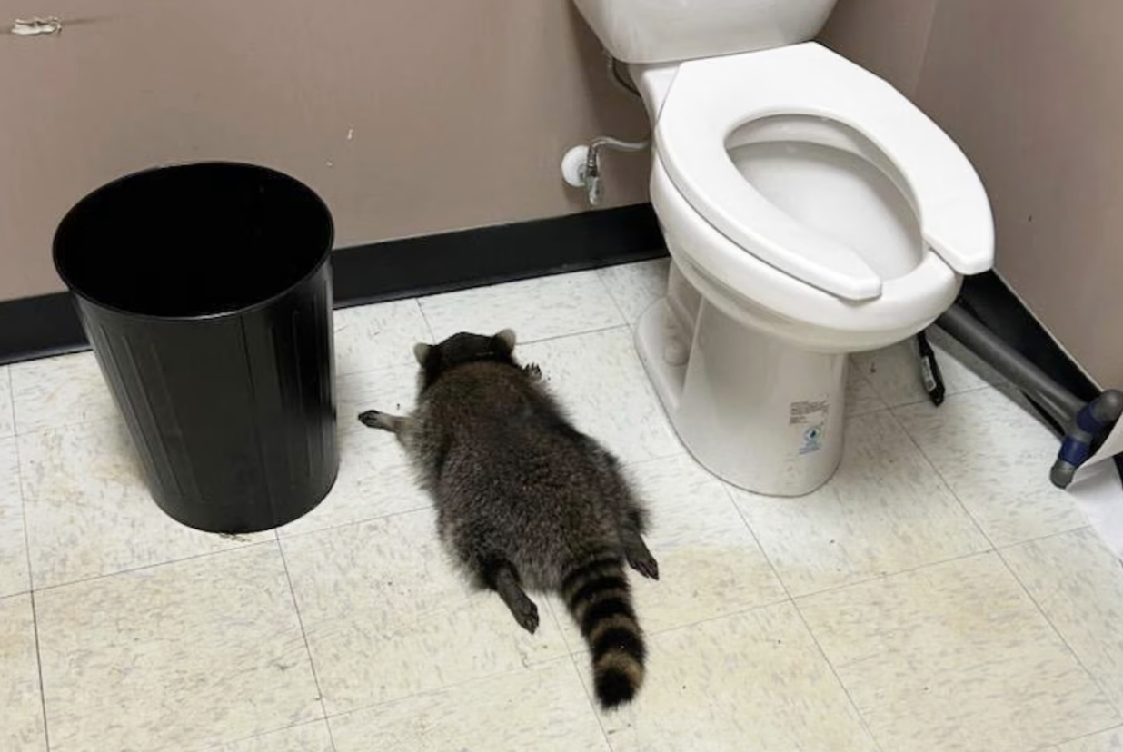 The suspect, an intoxicated raccoon, was found passed out in the store’s restroom the following morning.