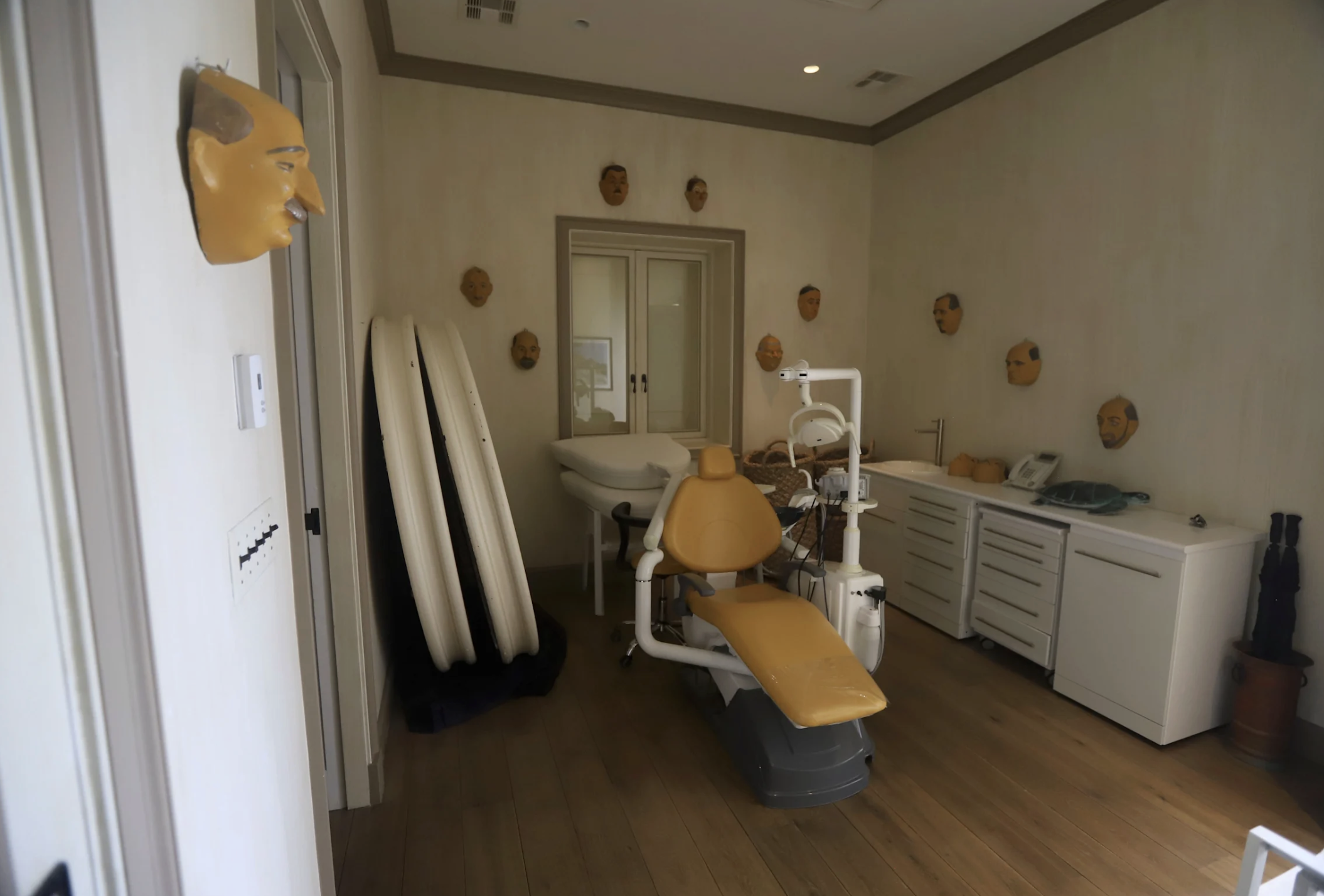Among the photos released was a room with a dentist’s chair, eerily surrounded by male masks hanging from its walls.